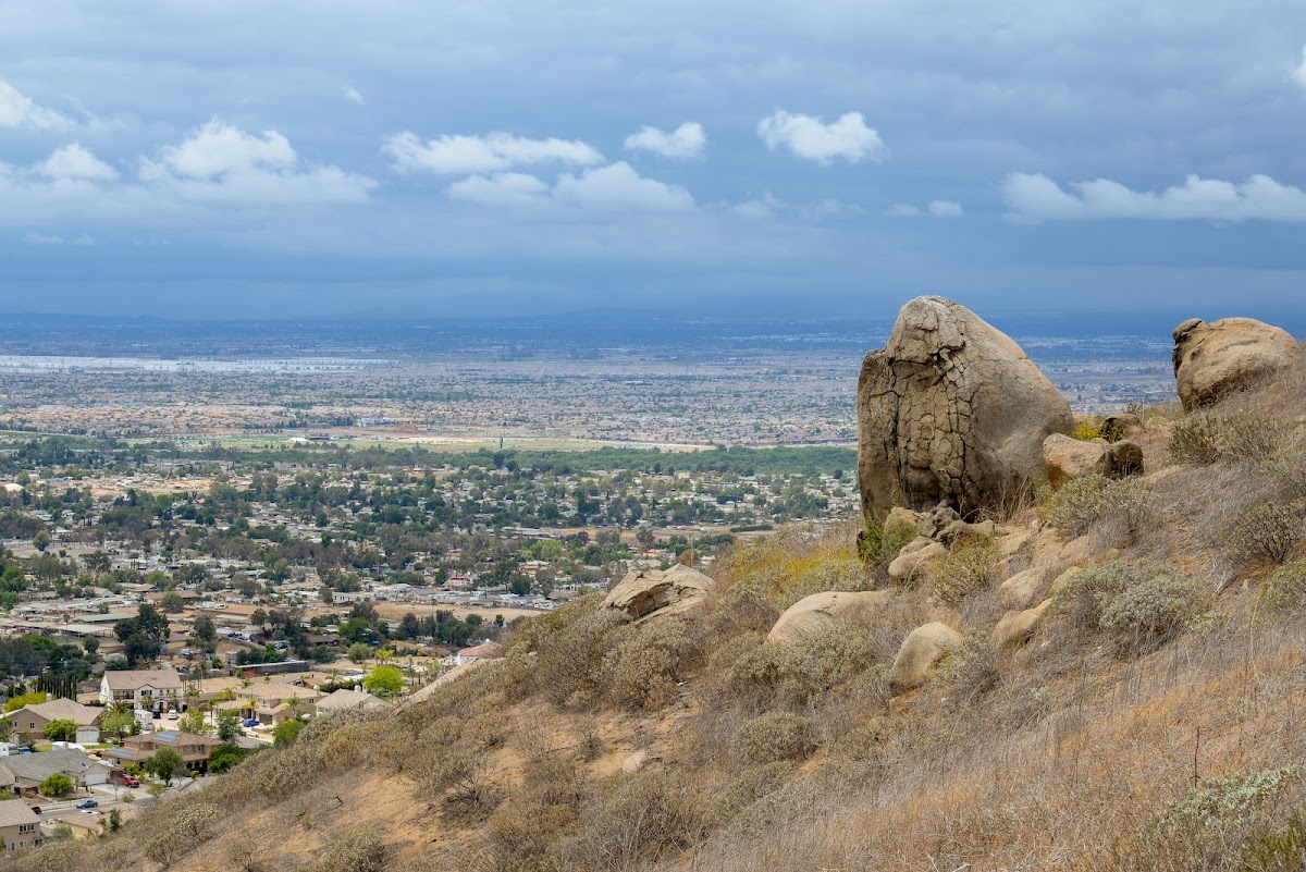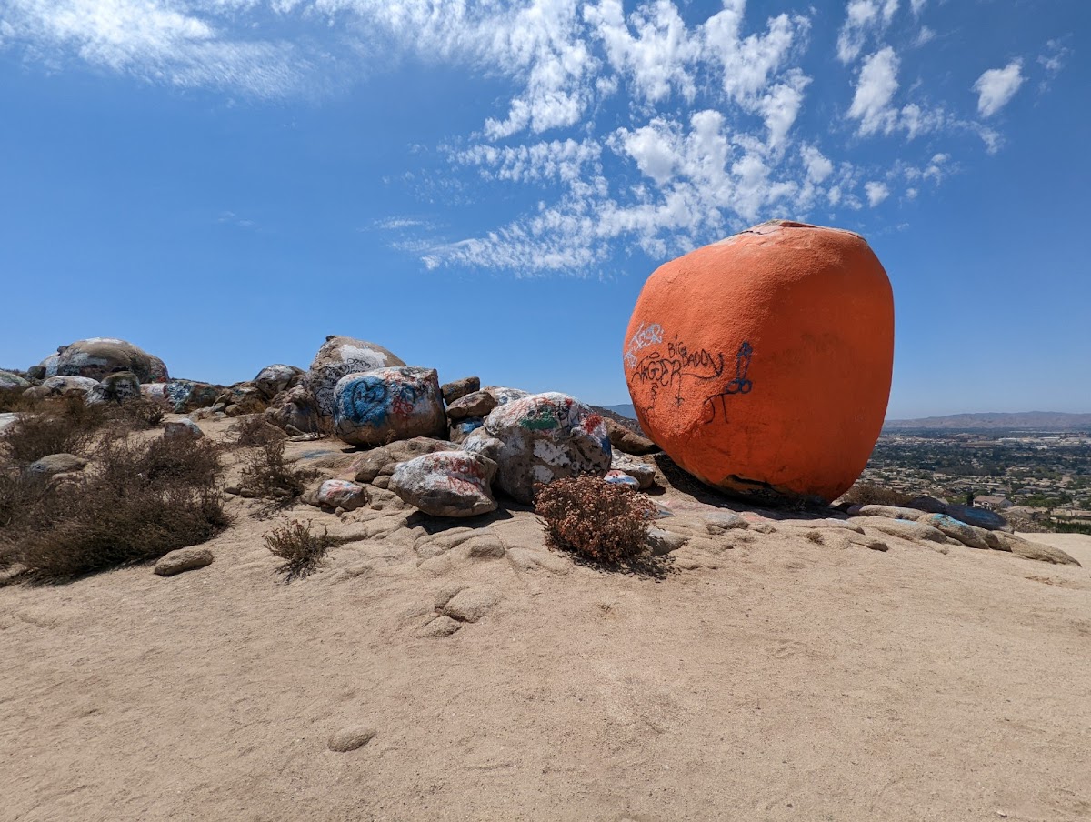 A unique local landmark and popular hiking destination. A large, pumpkin-painted rock with a Jack-O-Lantern face that overlooks the city.
